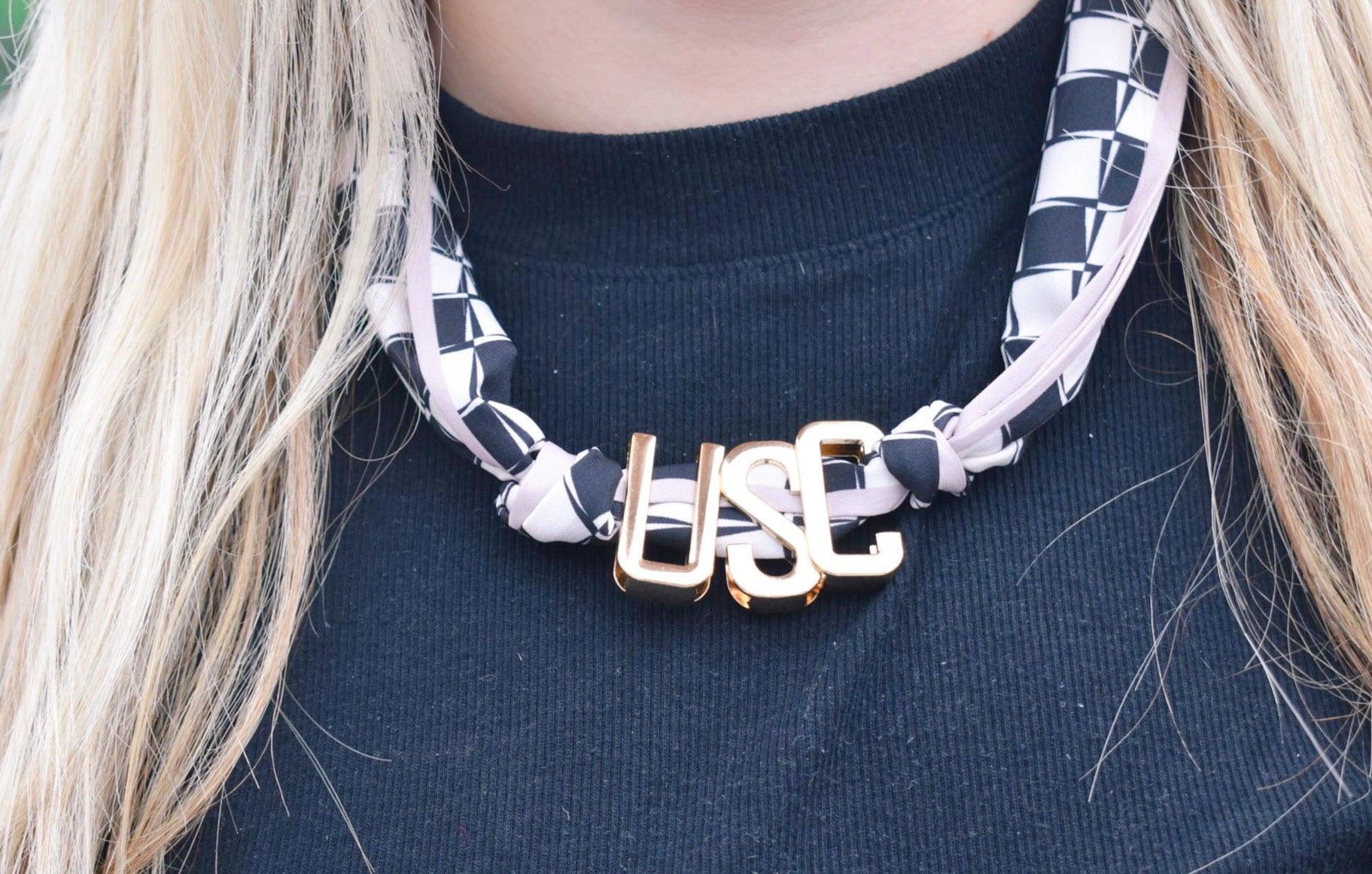 Black and white  printed scarf necklace with gold usc letters can be worn many different ways!