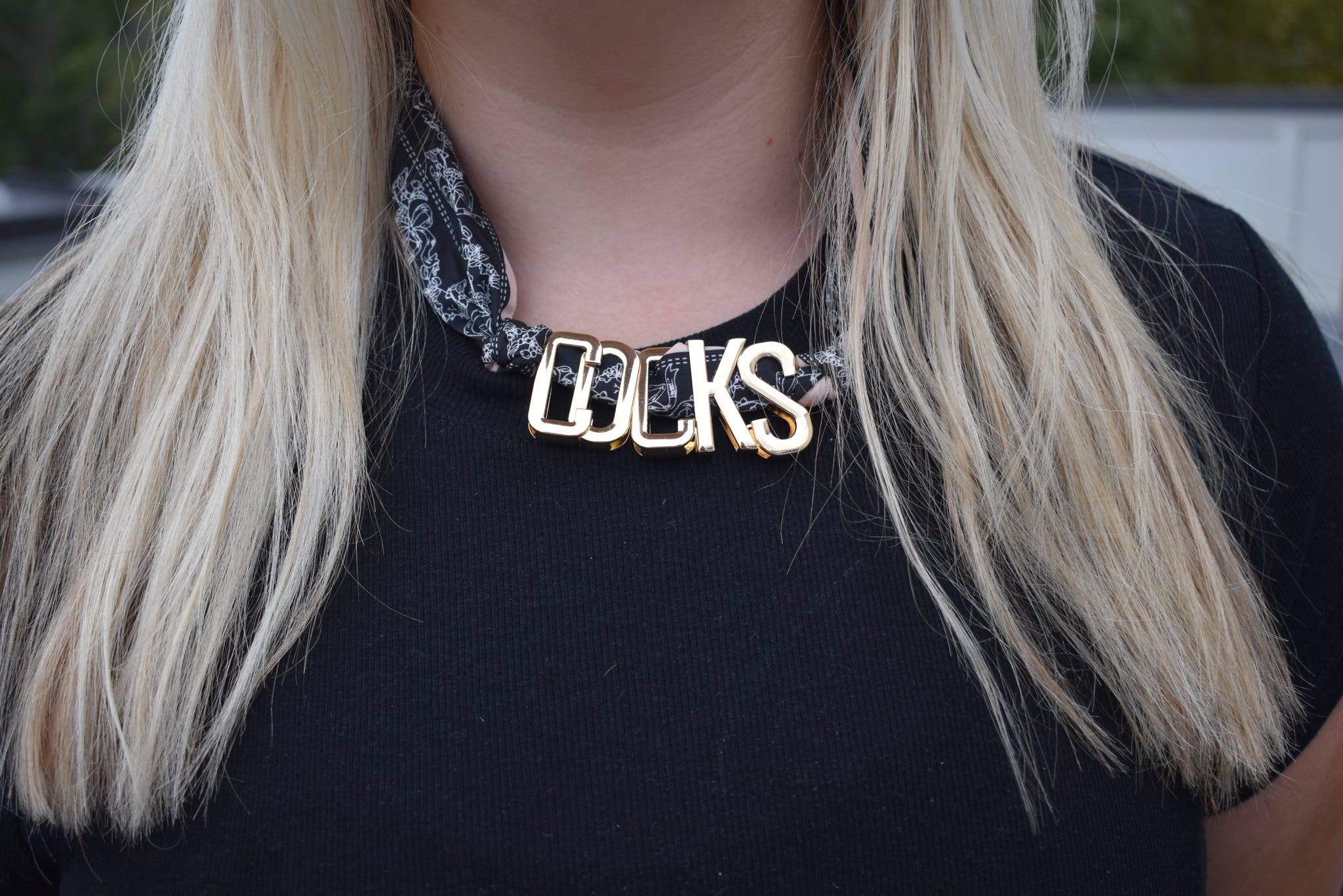 Black and white  scarf necklace with gold COCKS letters. can be worn many different ways!